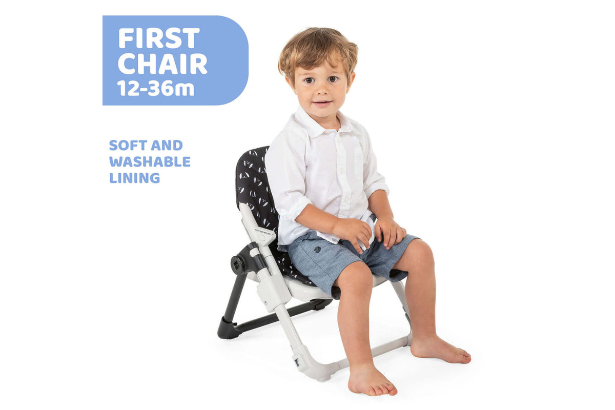 • First chair (12 – 36 m): by removing the tray and the belts, the booster seat can be transformed into a comfortable seat to rest on the floor, which can be used for moments of play or relaxation.