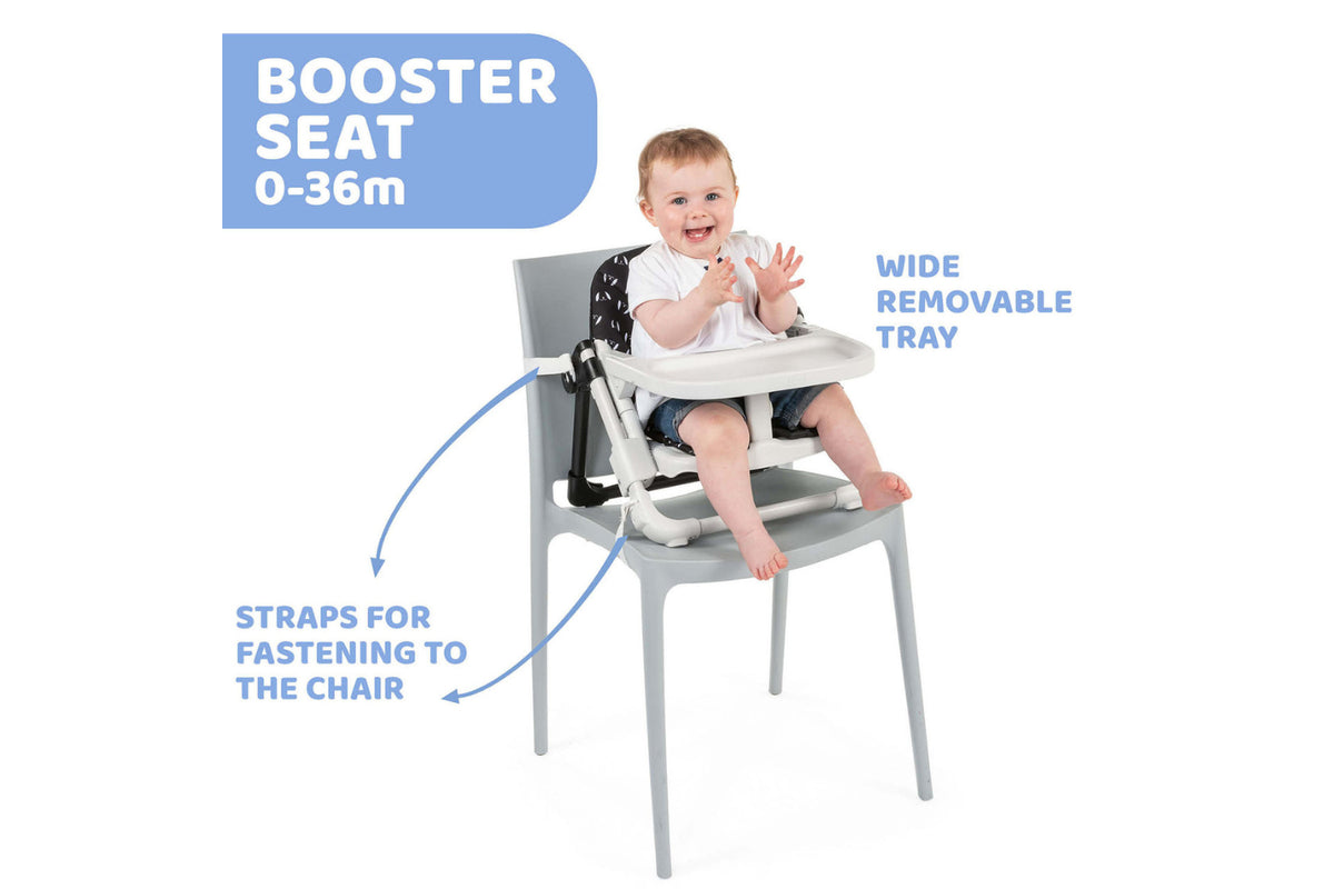 • Booster seat (6 – 36 m): equipped with a large removable tray, Chairy represents a practical aid to allow your child to share his first meals with the whole family.