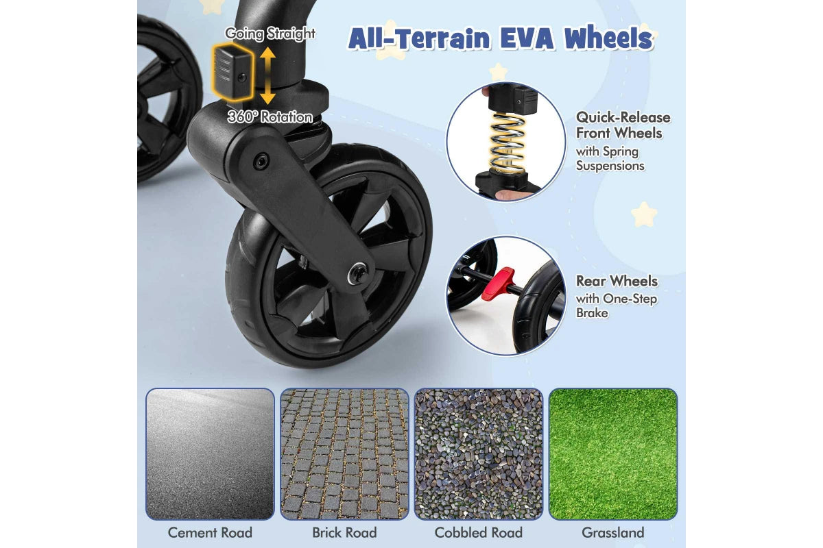 All-terrain EVA wheels ensure a smooth and safe using experience