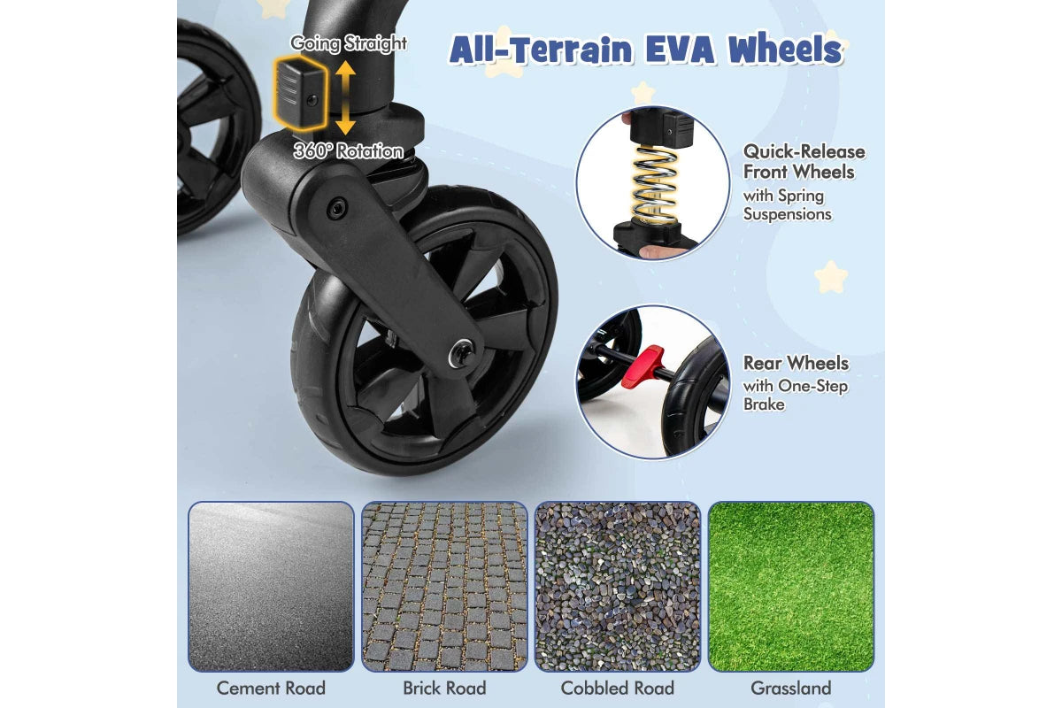 All-terrain EVA wheels ensure a smooth and safe using experience