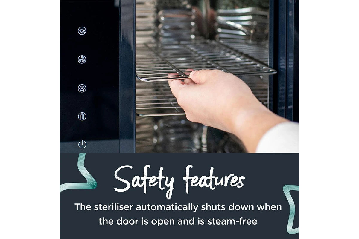 The steriliser, dryer and storage unit can hold up to six 150ml or 260ml bottles at a time, which is perfect for your daily bulk sterilising routine. The adjustable shelves give you the option to customise the space to fit any other breastfeeding or baby accessories.The baby bottle steriliser has an internal Philips UV bulb that lasts up to 6,000 hours. It also sterilises without steam and water so bottles and accessories are cool to touch when the cycle is complete. For added safety, it comes with an auto shut down feature whenever the door is opened.